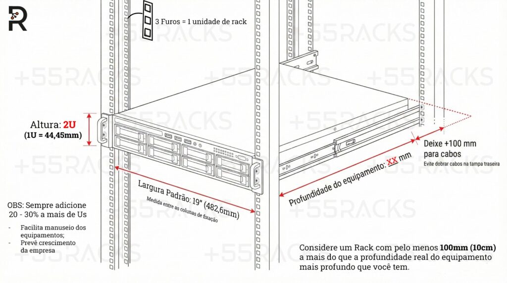 Dica profissional: compre o rack com 20% a 30% de folga (Us livres). Isso facilita manutenção e permite expansão sem trocar o gabinete depois.
